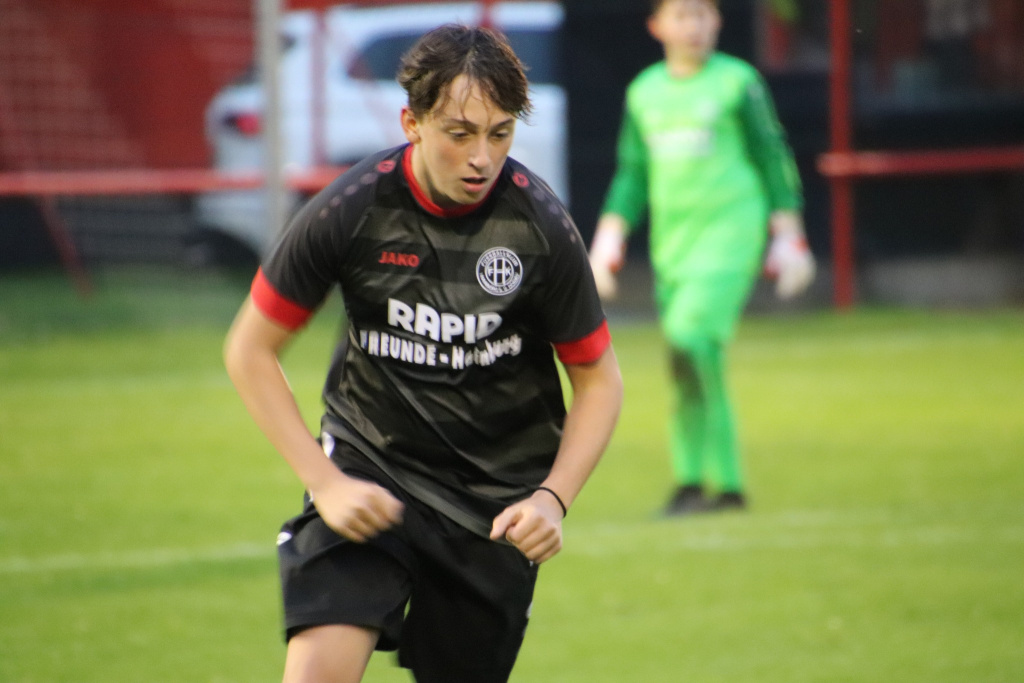 Die Mannschaft begann erneut „wie von der Tarantel gestochen“ und legte wieder einen wahren Traumstart hin. Durch Treffer des Sturmduos Alexej und Simon gelangen uns wie schon in den letzten beiden Spielen zwei frühe Tore. Dieses Mal versuchten wir nachzulegen und hatten weitere gute Möglichkeiten, u.a. einen Lattenschuss von Alexej. Der Matchplan, den Gegner in der eigenen Hälfte zu Fehlern zu zwingen ging voll auf. Brunn kam kaum aus der eigenen Hälfte raus und mit unserem Spielstil nicht zu Recht. Das 3:0 in der 26. Minute abermals von Simon war die logische Folge. Zu diesem Zeitpunkt hätten wir auch schon höher führen können. Durch eine Unachtsamkeit kamen die Gäste dann praktisch aus dem Nichts zum Anschlusstreffer. Auf die dann eher ruppige Gangart der Brunner antworteten wir mit einem Treffer von Kapitän Moritz Gross, nach toller Vorarbeit von Alexander Macher und stellten vor der Pause den 3 Tore Vorsprung wieder her.
