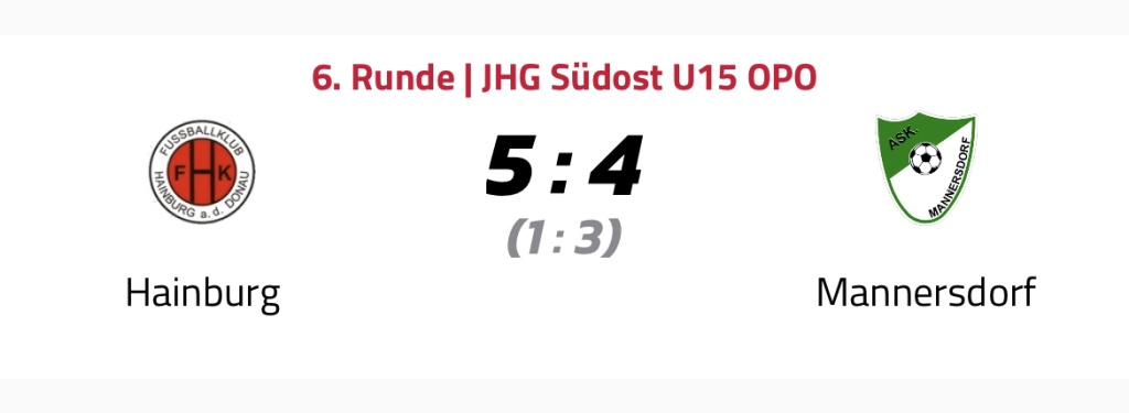 Die U15 des FK Hainburg schlägt Tabellenführer Mannersdorf nach einem 1:4 Rückstand und einer fulminanten Aufholjagd mit 5:4 (1:3). Die Hainburg-Tore erzielten 3x Simon Owesny und 2x Christoph Hiermann.