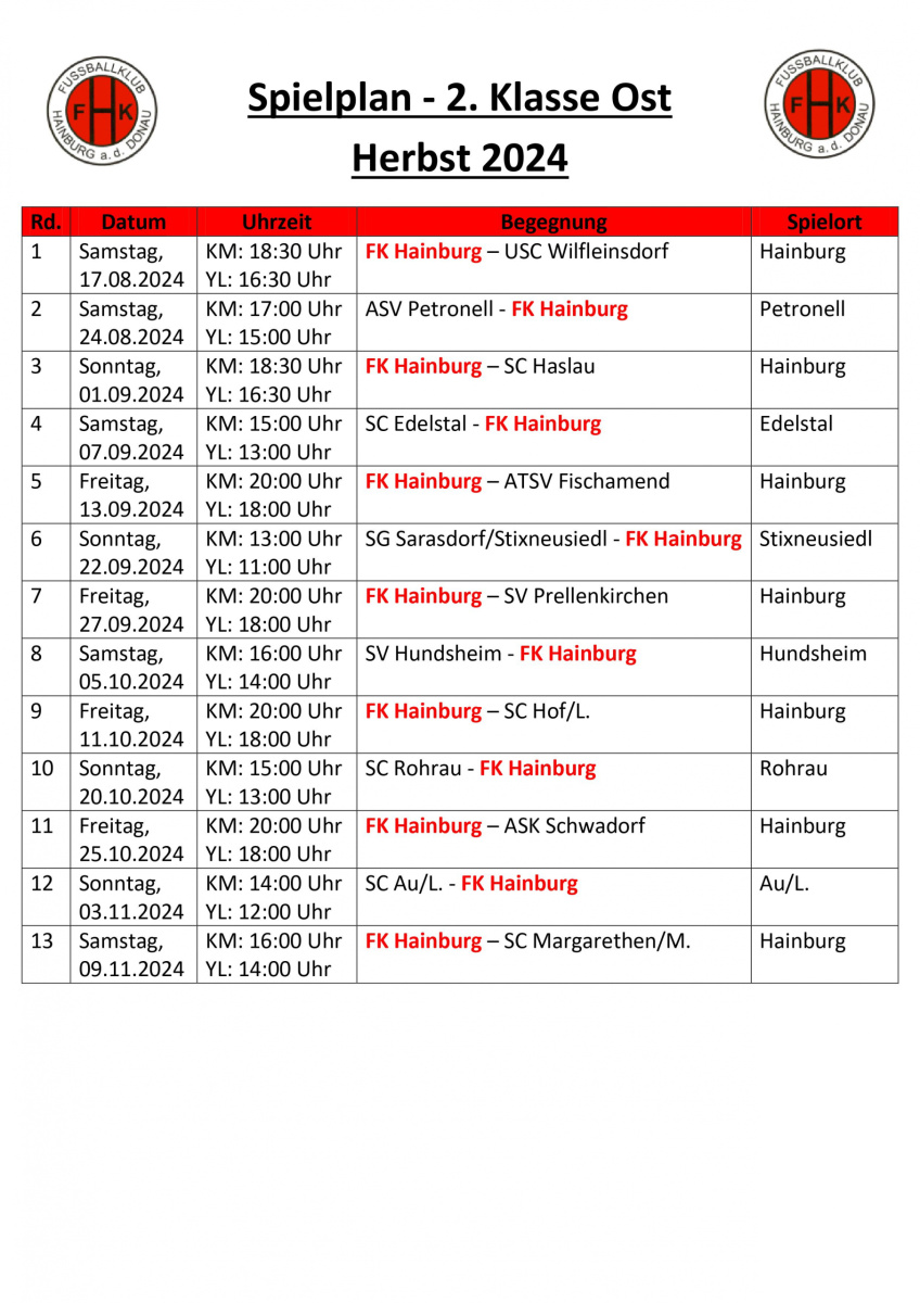 Der FK Hainburg startet am Samstag, 17.08.2024 (KM: 18:30 / YL: 16:30) mit dem Heimspiel gegen den USC Wilfleinsdorf in die Herbstmeisterschaft 2024.