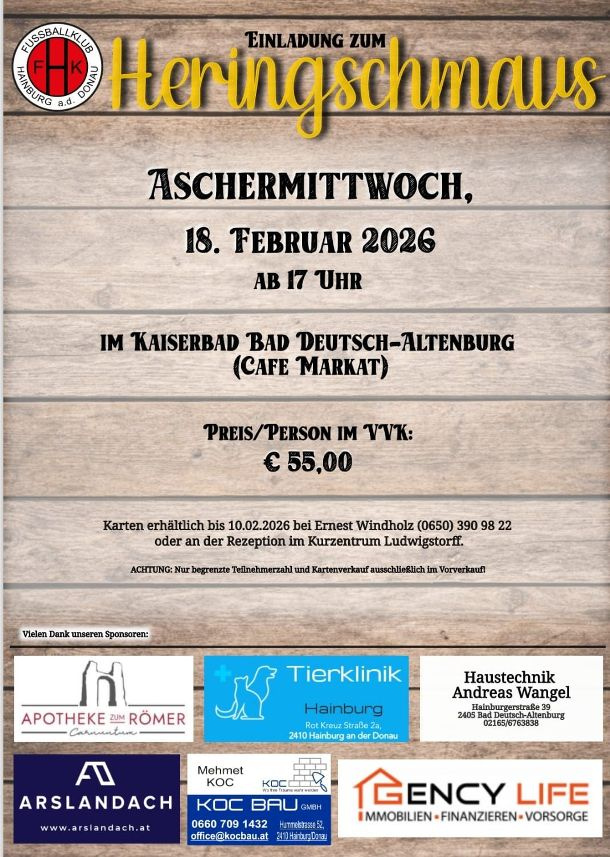 Der FK Hainburg lädt erstmals zum Heringschmaus im Kaiserbad Bad Deutsch Altenburg ein. Jetzt Karten reservieren!